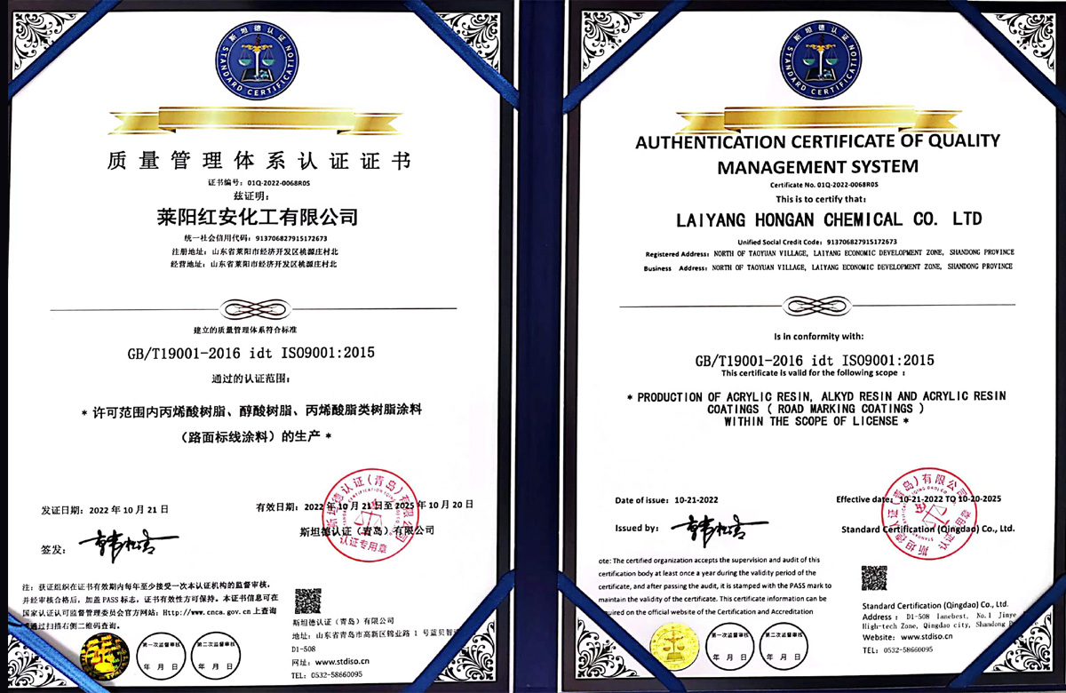 紅安化工經(jīng)過近二十年的打造和積淀,現(xiàn)已建成了一家專業(yè)研制生產(chǎn)涂料合成樹脂的綜合型工廠,位于山東省半島的腹地--萊陽市。公司已通過了三體系認(rèn)證,即ISO9000質(zhì)量管理體系認(rèn)證和環(huán)境、職業(yè)健康安全管理體系認(rèn)證,并獲得了六項(xiàng)國(guó)家發(fā)明專利,八項(xiàng)實(shí)用新型專利;19年榮獲山東省高新企業(yè)稱號(hào),22年通過了復(fù)審;22年榮獲山東省瞪羚企業(yè)稱謂,還有其他一些榮譽(yù)稱號(hào)不再一一敘說。 公司現(xiàn)有樹脂合成反應(yīng)釜29套,各類樹脂年生產(chǎn)能力約8萬噸,具有完善的檢測(cè)儀器和應(yīng)用服務(wù)條件。